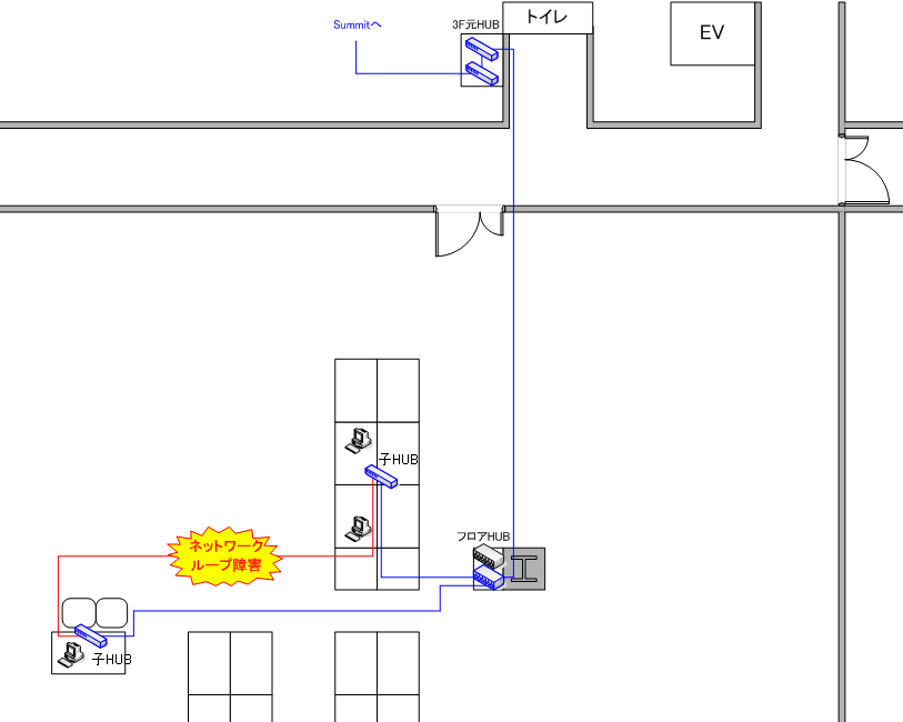 原因はユーザーがLANケーブル整理を行ったためで、建物全体(1F~6F)のネットワーク障害へ発展しました。