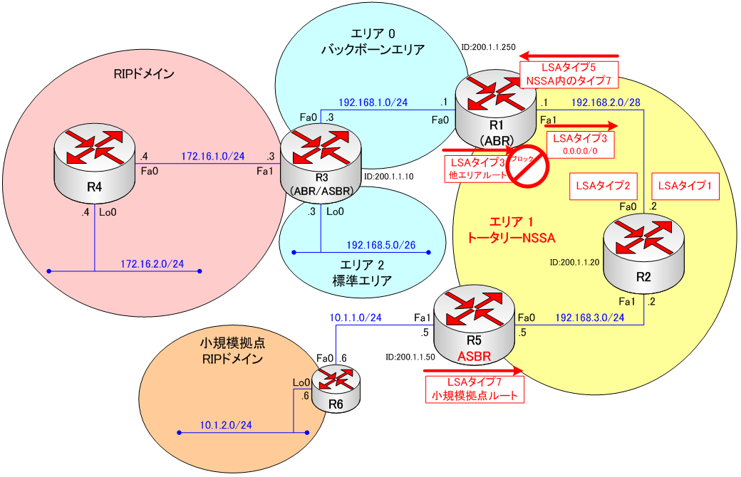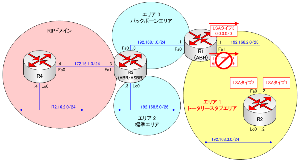 トータリーNSSAは、他エリアルートのLSAタイプ3をブロックし、