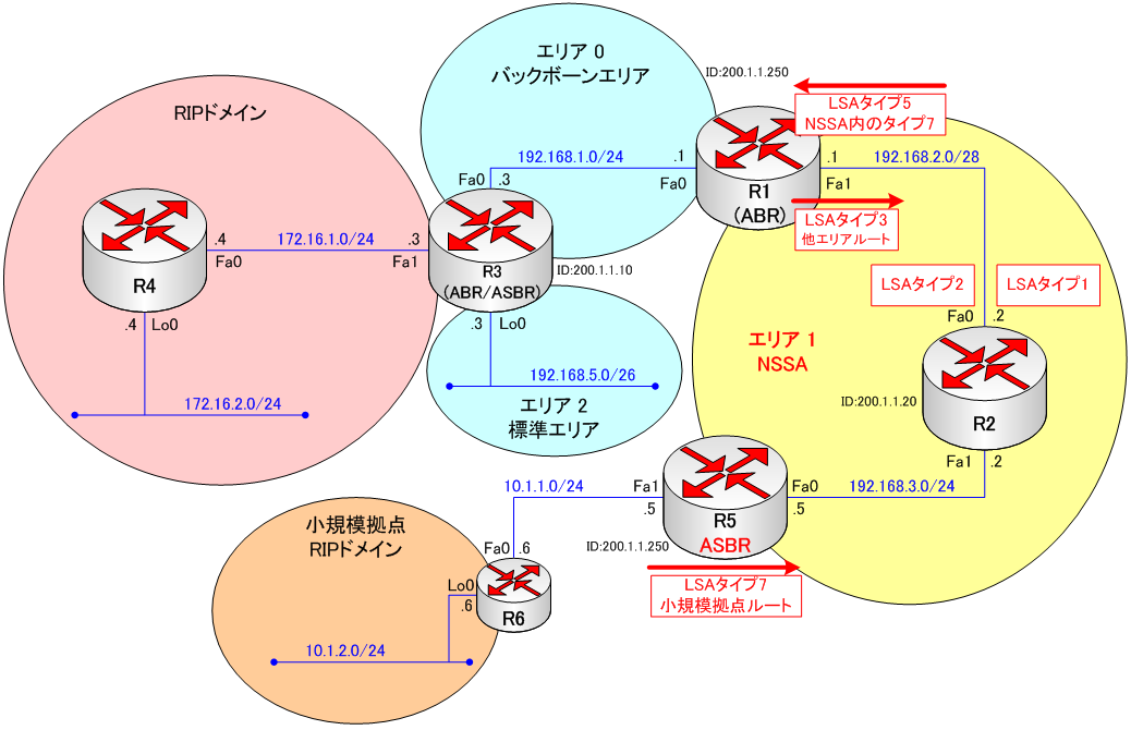 まず、エリア1をNSSAにするためにR1・R2・R5に対してNSSAの設定を行う。