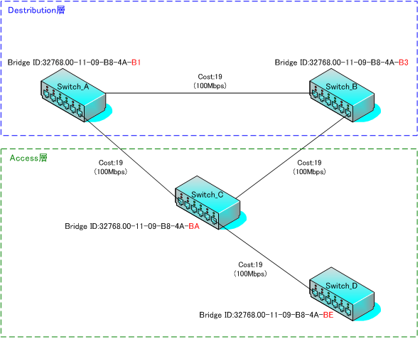 下図のようなスイッチドネットワークにおいて、ルートブリッジの選択を制御したい。