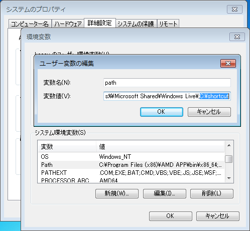 コンパネ → システムのプロパティ → 詳細設定 → ユーザー環境変数(またはシステム環境変数)内にある、
