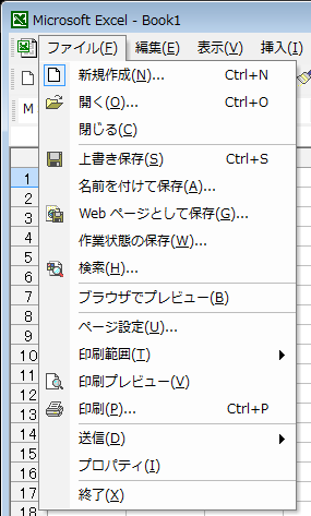 大抵は下図のようにメニューの右側に対応するショートカットキー(Ctrl + ○)があるので分かるかと思います^p^