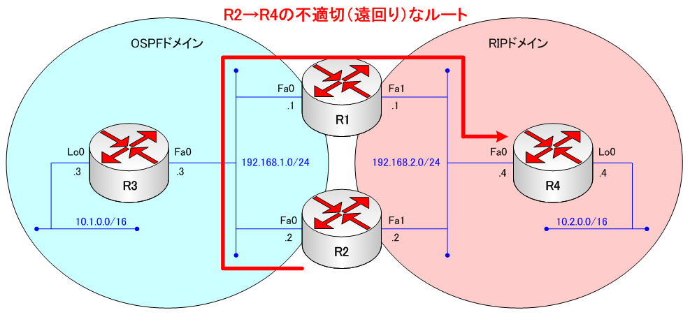 このように複数のルータで再配送を行うと、最適なルートを選択しないことが分かる。(下図参照)