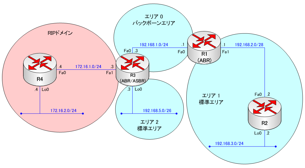 R3(config-router)# network 192.168.5.0 0.0.0.255 area 2 //標準エリア 2